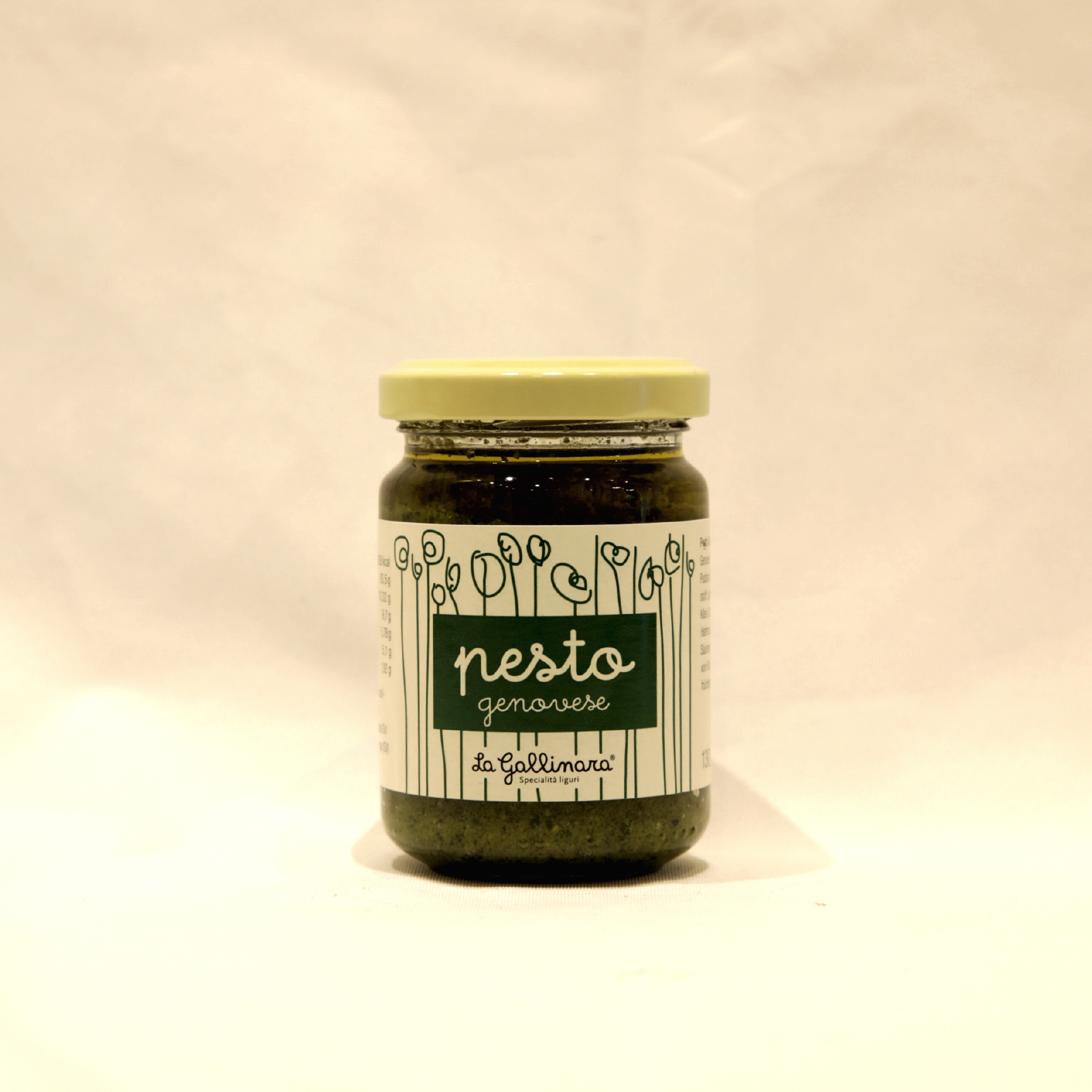 Pesto Genovese aus Ligurien, die aus frischem D.O.P. Genovese Basilikum, hochwertigem Olivenöl extra, feinen Pinienkernen, einem Hauch Knoblauch und Parmigiano Reggiano hergestellt wird.