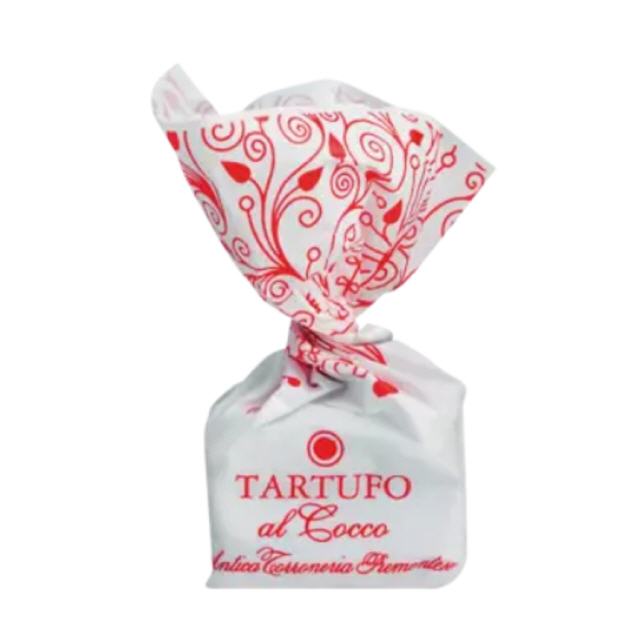 Feiner, edler Tartufi dolci aus weißer Schokolade, mit Haselnussstückchen und Kokos.